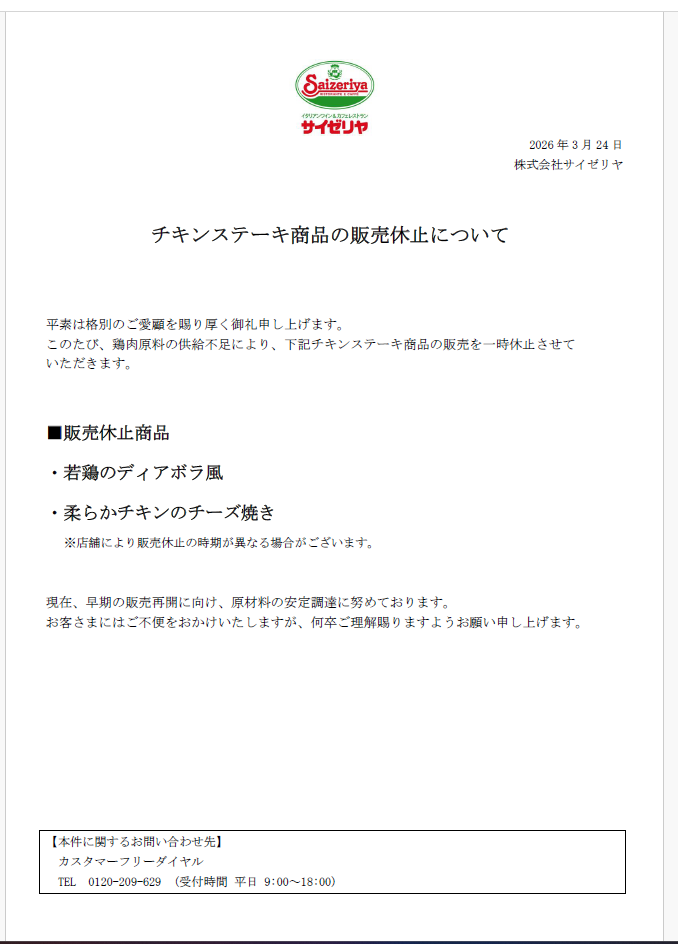 2026年3月24日にサイゼリヤより悲しいお知らせが(´;ω;`)ウゥゥ