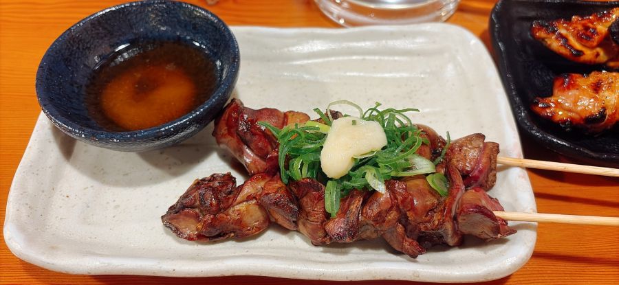 写真左が「きも焼 塩ごま油添え」、写真右が「名物 もも貴族焼(たれ)」です。