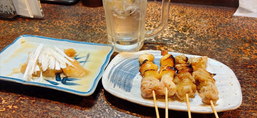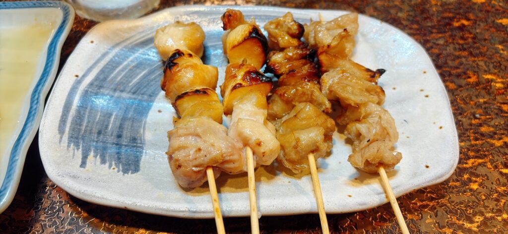 左からスタミナ串、とり皮串。どちらも塩でいただきました。