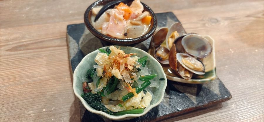 写真手前から、ほうれん草柚子浸し、奥が、かぶのクリーム煮、右が、あさりの酒蒸し。