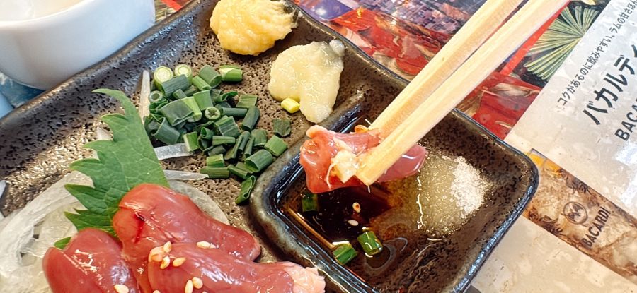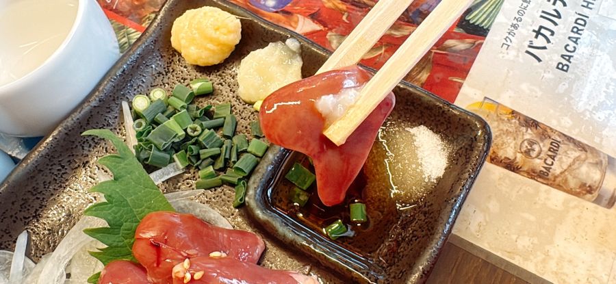 新鮮な鶏のハツ刺しをしょうがとごま油で。