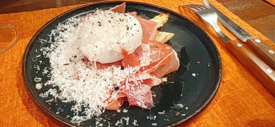 ホワイトアスパラガスとプロシュート、玉子、チーズが一皿に。