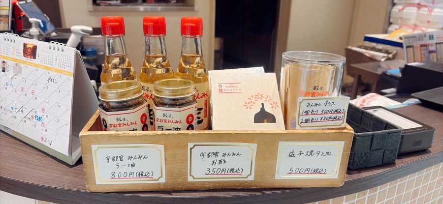 レジのところにラー油やお酢、益子焼のタレ皿が売ってました(*’▽’)