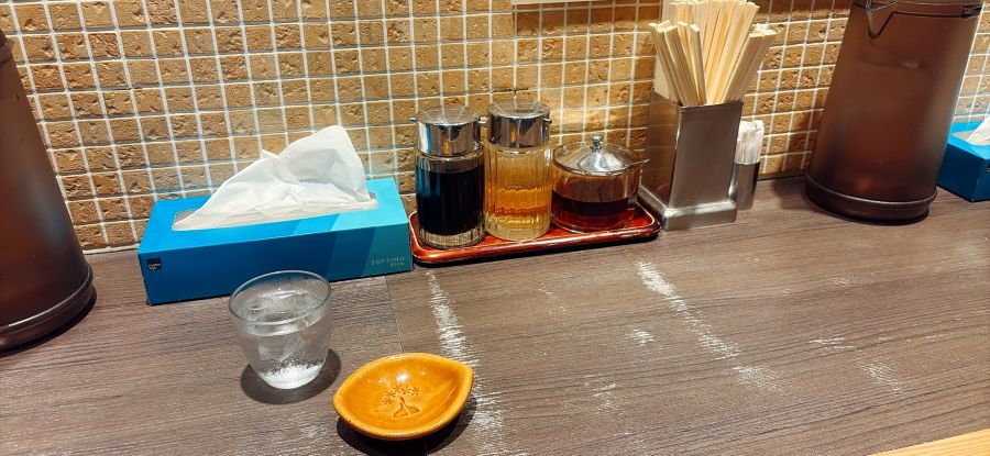 卓上には、しょうゆ、お酢、ラー油のみで、コショウはありません。
