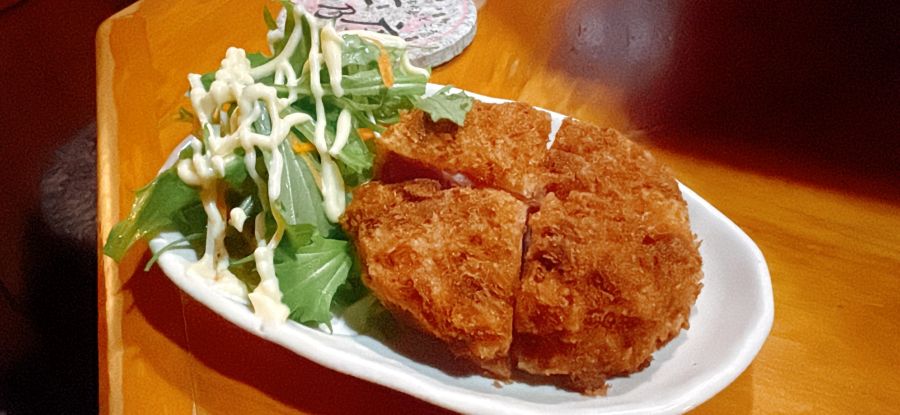 揚げ物食べたいな~なんて思ったので、こちらを頼んだのですが、ハムカツもあって、どちらにしようか迷いに迷っていたら、お隣で飲んでいた方が、ハムカツ頼むから、お裾分けしますよと言ってくださって(≧▽≦)